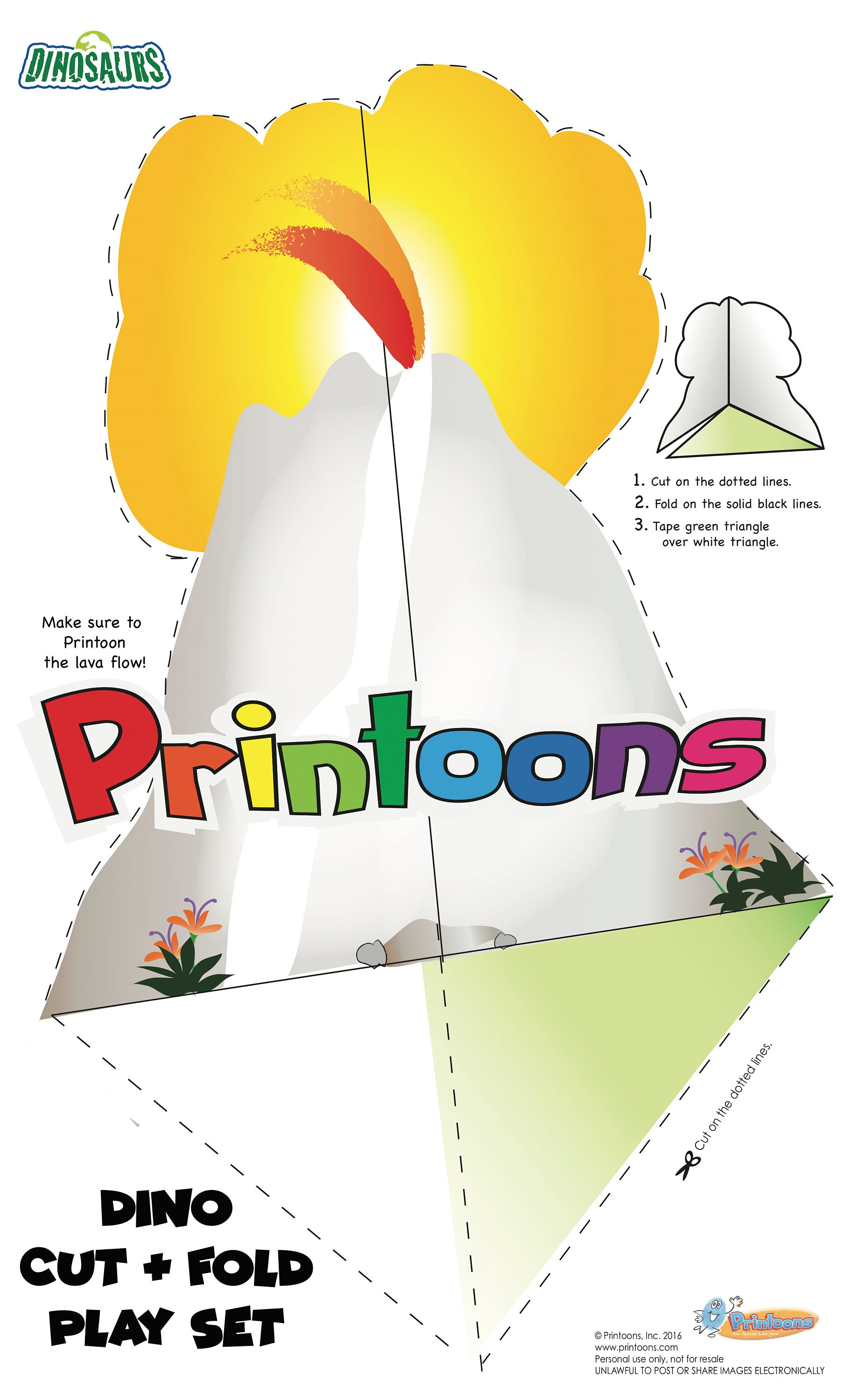 Kids will make their own 3D PREHISTORIC DIORAMA with this very creative and tactile kit. There are 3 pages of challenging PREHISTORIC PRINTOONS CHARACTERS, TWO 3D VOLCANOS AND A 3D PALM TREE WITH NEST, and 3 PAGES OF CHARACTER STANDS WITH A 8X14 BACKDROP THAT CAN BE PRINTED OUT TO SUPPORT THE SCENE. Kids will have so much fun Printooning and cutting out and folding the stands. They can arrange their characters around volcanos and trees. Art skills and imagination will run wild with this kit.
