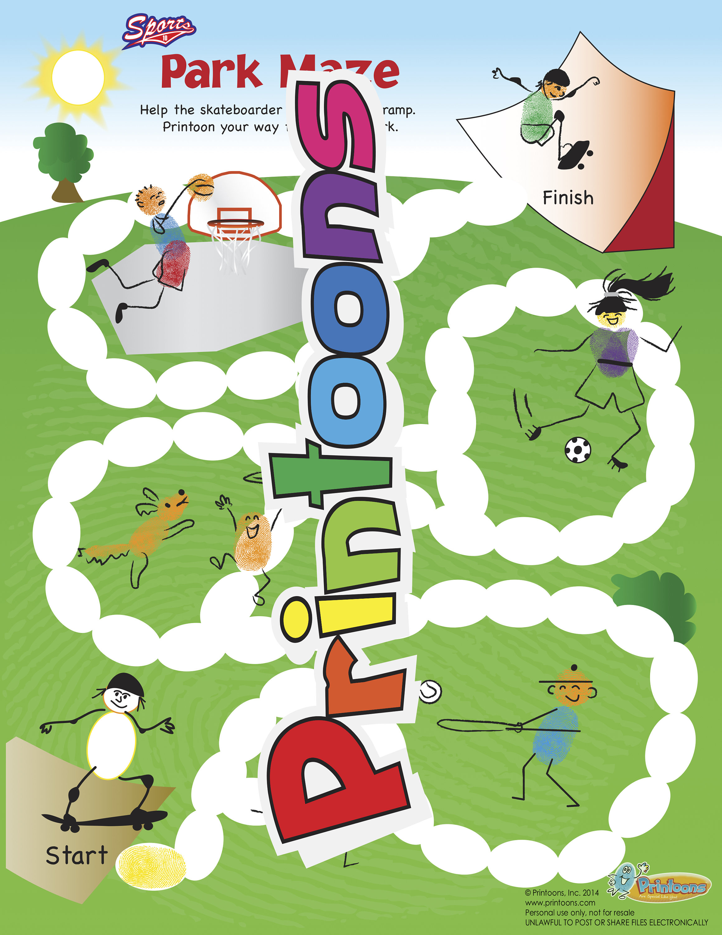 EQUIPMENT: You will need access to a good color printer, 8.5" x 11" paper, water color ink pads, and writing instrument such as pencil, rolling ball pen or fine felt tip marker. You can print out the cover and glue to a pocket folder to make a Printoons Fingerprint Art Kit, keeping all the pages together.